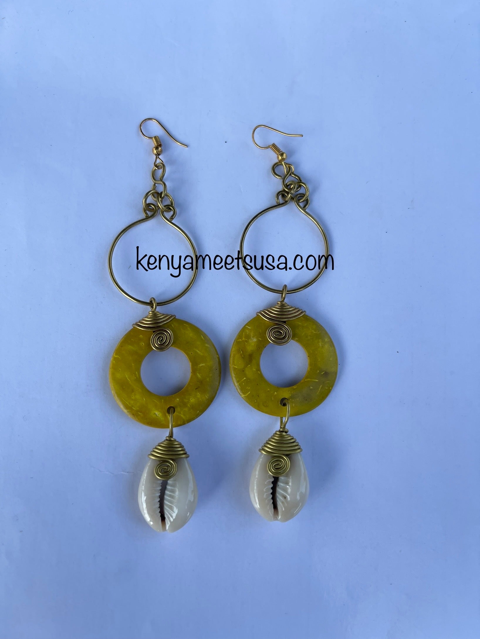 The cowrie shells are securely attached to the coconut shell circle using durable wire ensuring they remain in place while allowing for natural movement. The warm golden brass complements the earthy tones of the coconut shell and the creamy white of the cowrie shells.
