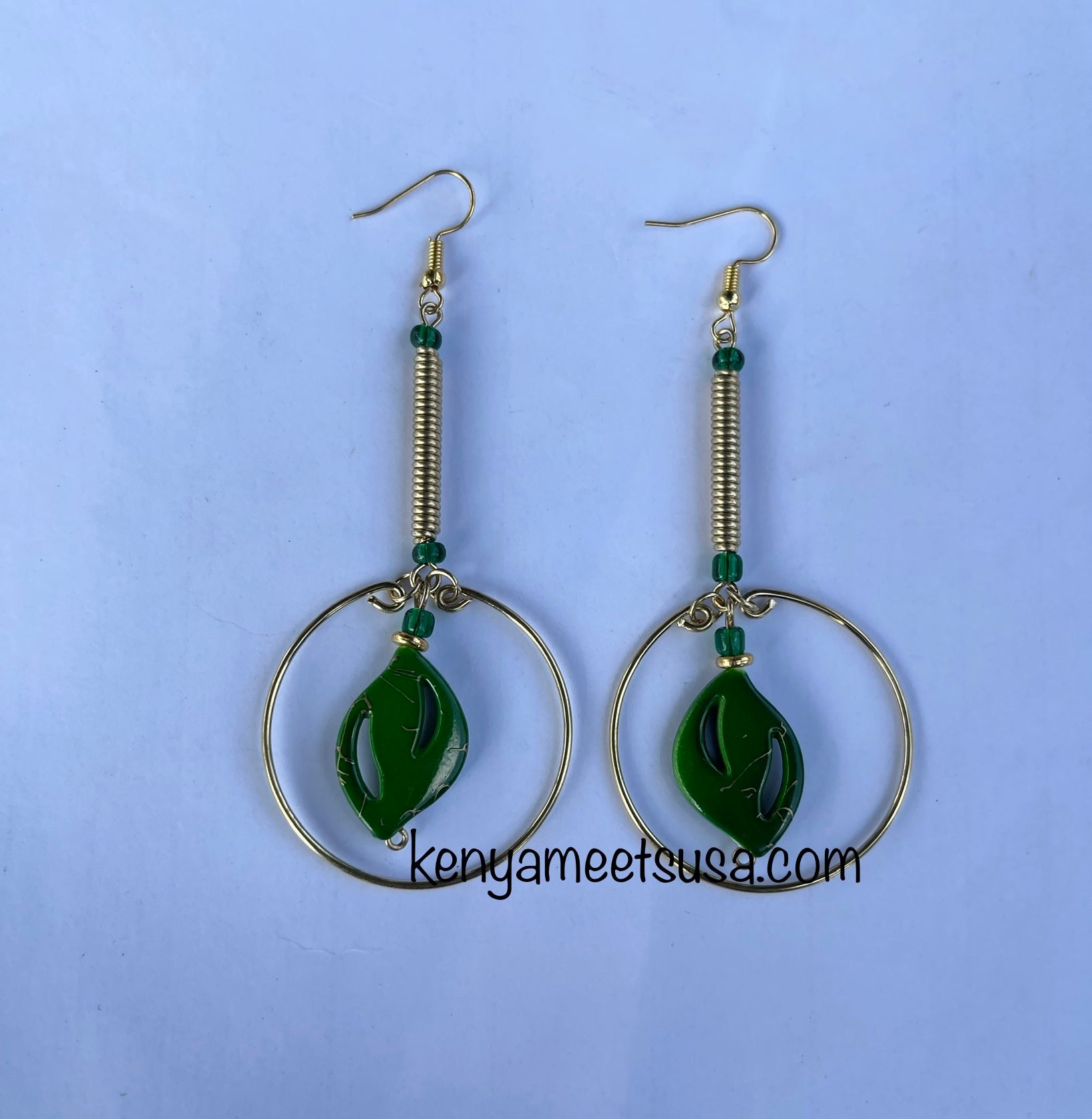 This handcrafted earring from Kenya showcases a beautiful brass spiral at the the top, descending into a hollow circular pendant below. The brass material adds a golden hue, making it a versatile accesory that can enhance any outfit with a unique, artistic flair.